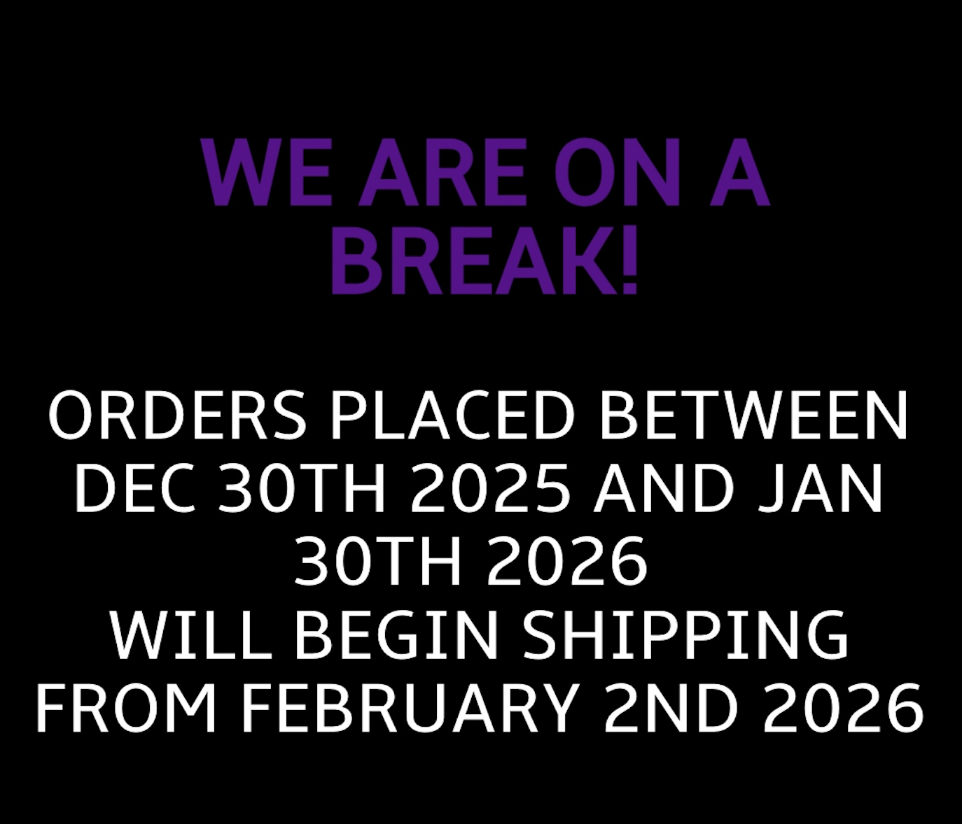 Orders placed between Dec 30th 2025 and Jan 30th 2026 will commence shipping from Feb 2nd 2026
